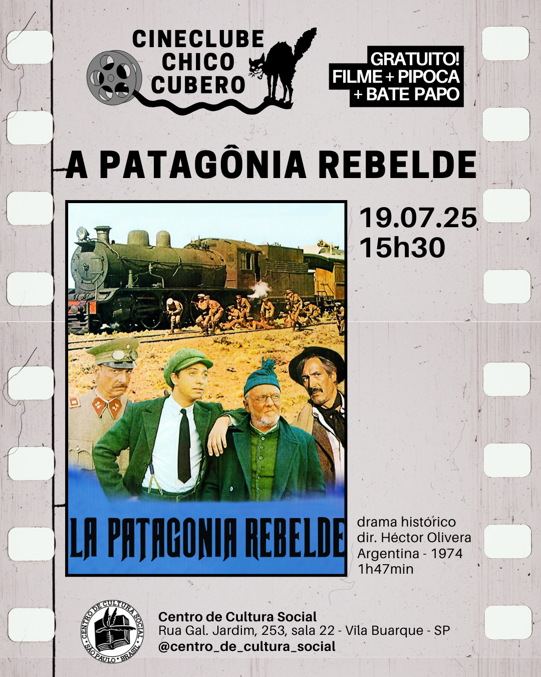 Leia mais: 19/07/2025, sábado, às 16h - Cineclube Chico Cubero: exibição do filme "Patagonia rebelde"